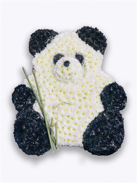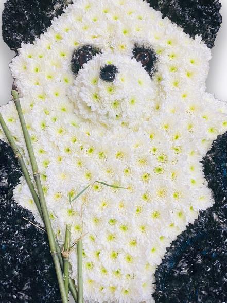 Flat Panda tribute, completely massed in chrysanthemum with pieces of bamboo.