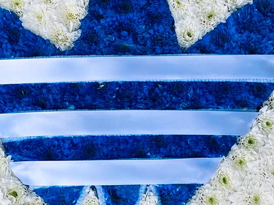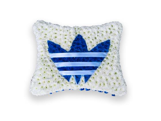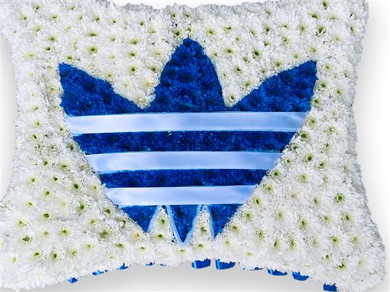 A simple adidas pillow tribute with ribbon edging, which is massed in white chrysanthemums with the logo sprayed blue and used ribbon for the stripes.