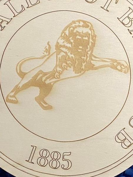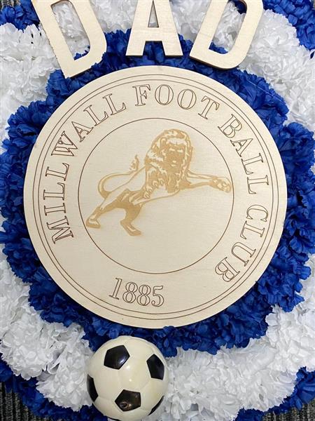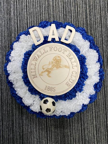 A blue and white posy with the Millwall badge in the centre and a wooden 'DAD' on top.