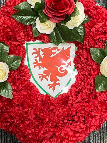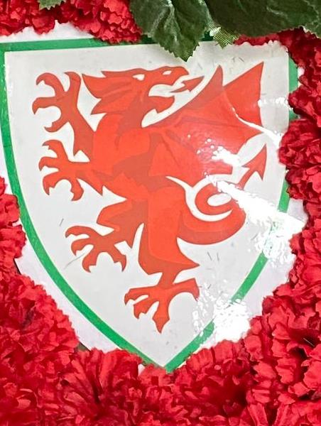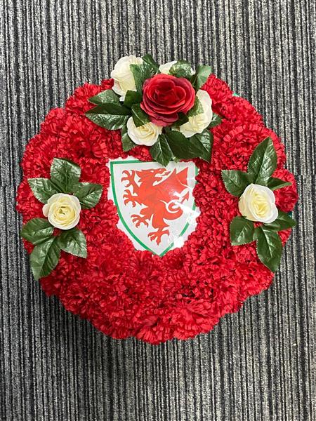 A red posy pad with ribbon edging and Welsh badge in the centre.