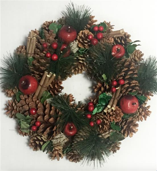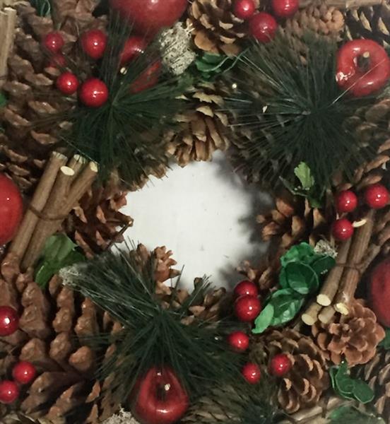An artificial traditional wreath, decorated with pinecones, berries and artificial apples.