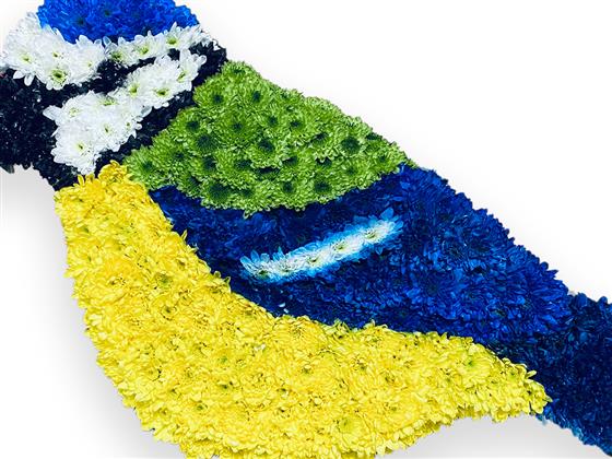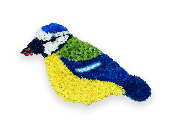 2D blue tit bird which is completely massed chrysanthemums and sprayed in colour.