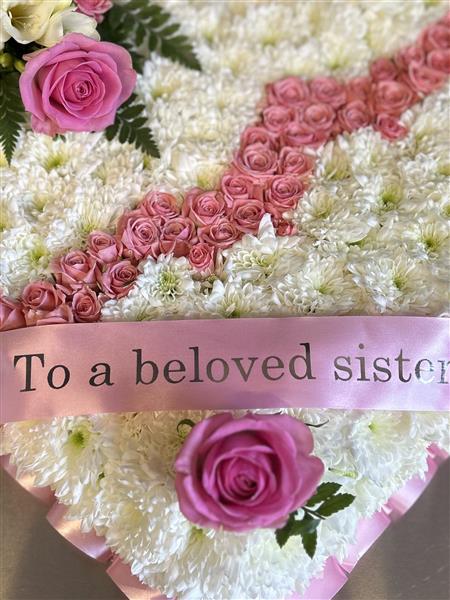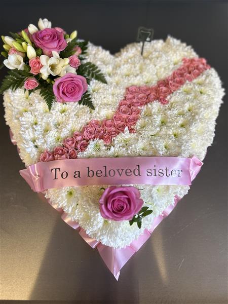 Based heart in white chrysanthemums, with rose and freesia corsage, and spray roses going through heart to represent heart being broken. The sash and corsage will be colour matched to the ribbon colour chosen.