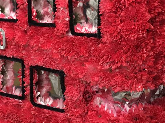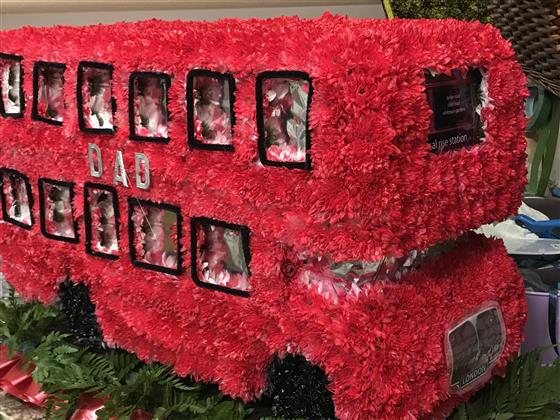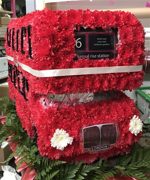 Double decker 3D bus . Based with chrysanthemums , and sprayed with floral red spray