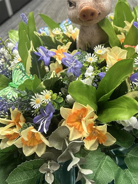 A lovely cat resin statue attached to an artificial flower display.