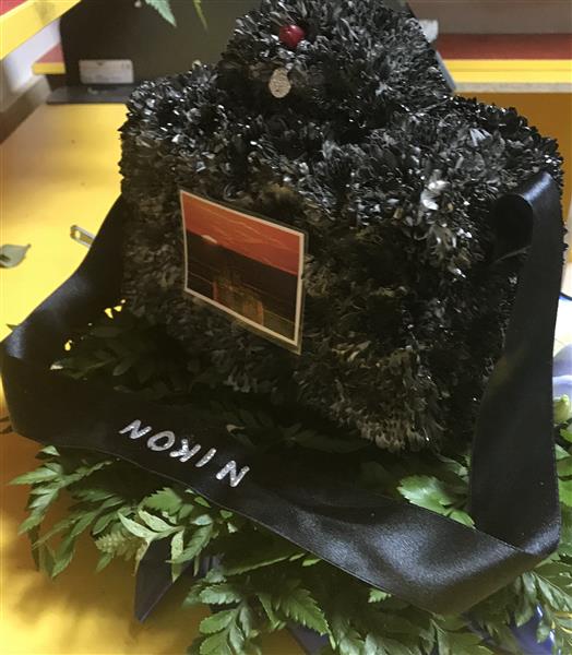 3d camera place on a cushion 14”base with sash and small corsage of flowers to the side. Camera size 10” x 7 “ approx