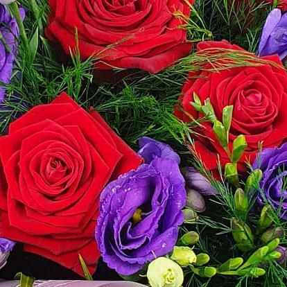 Brighten any space with rich red roses nestled among soft purple lisianthus, delicate freesia buds and textured seasonal greenery, creating a striking bouquet full of depth, contrast and elegant colour.