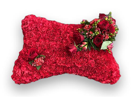 A pillow that is massed in carnations with ribbon edging and a matching corsage.