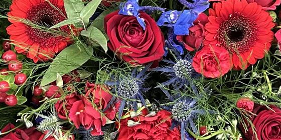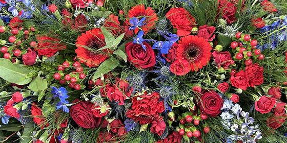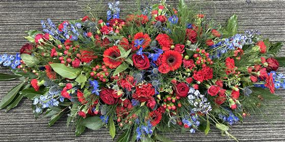 This beautiful casket spray is made of a seasonal selection of mixed reds and blue, please note if some flowers are out of season others will be added which are in season. Your spray will be mixed reds and blue.