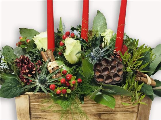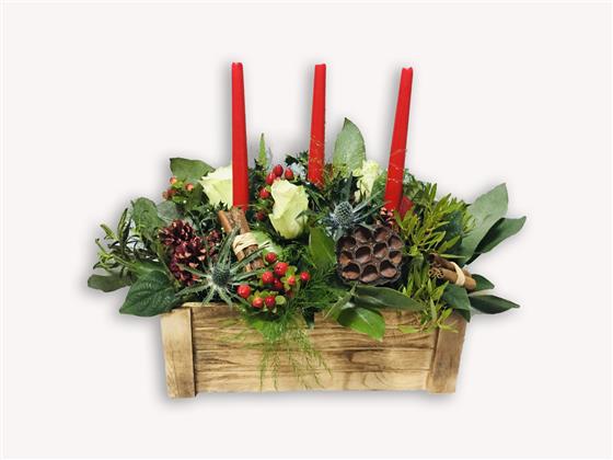 A christmas arrangement of holly and other greenery, with roses, decorations and three candles. The arrangement is in a wooden crate (CRATE BOX DESIGN MAY VARY TO STOCK LEVELS AVAILABLE)