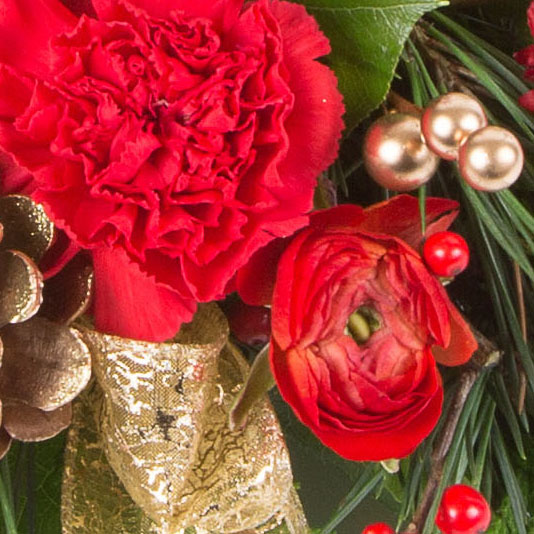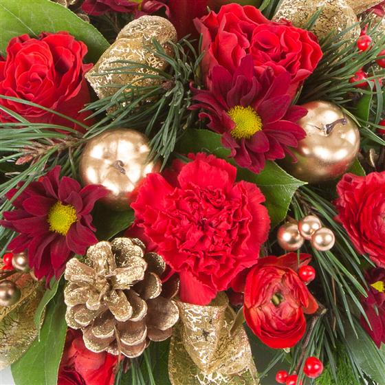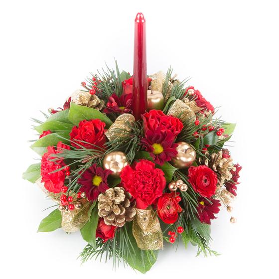 A traditional favorite, this spruce arrangement including cones and berries is perfect as a table centre. COLOURS MAY VARY SLIGHTY TO REDS AND GOLDS , REDS AND GREENS, REDS AND SILVERS.