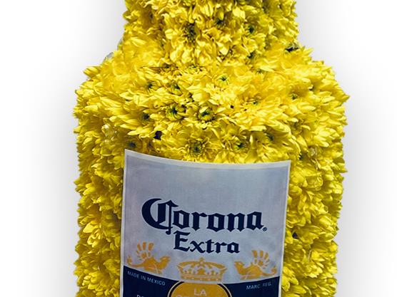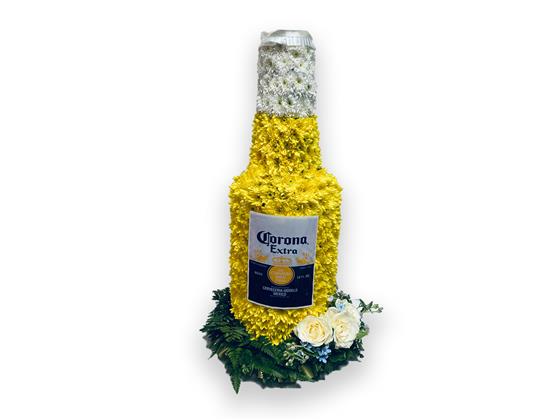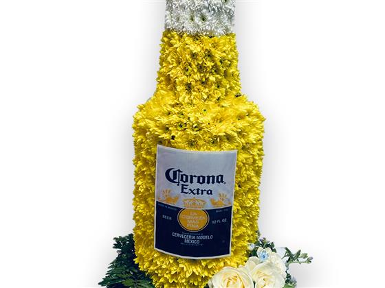 This bottle tribute was massed in white and yellow chrysanthemums, and we printed the cap and label. The base of the tribute is covered in greenery.