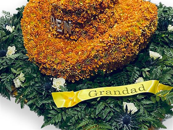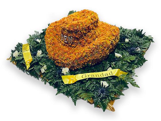 The base of this tribute is covered in greenery and a few small roses. The cowboy hat is completely covered on bronze chrysanthemums and silver letters are put on the front of the hat.