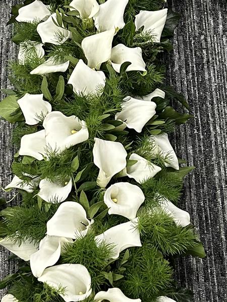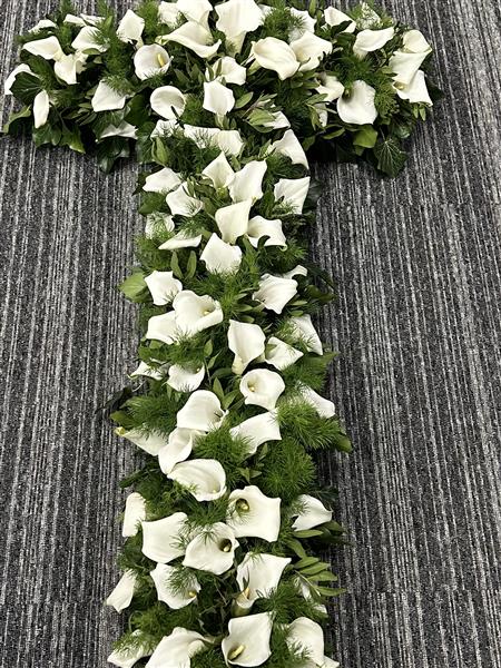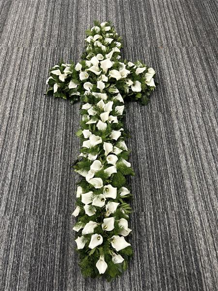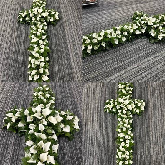 A beautiful cross made of just small crystal blush calla Lillie’s and green dark foliage.
