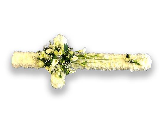 sleep peacefully all white cross, based white, with a spray through the centre of roses,white calla lily freesia, lizianthus,mixed foliage.