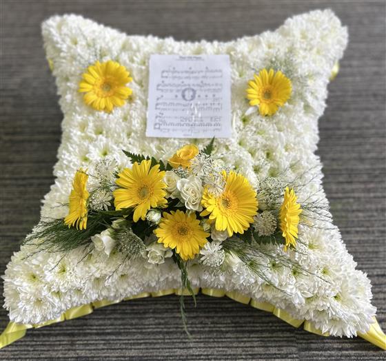 This is a 17 inch cushion, massed white, corsage spray at the bottom , a laminated personalised note , picture or ….