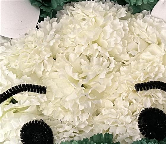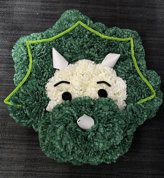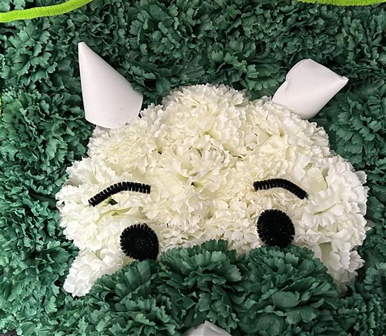 Pictured is the cute dinosaur face made of artificial flowers, fresh flowers can be requested.