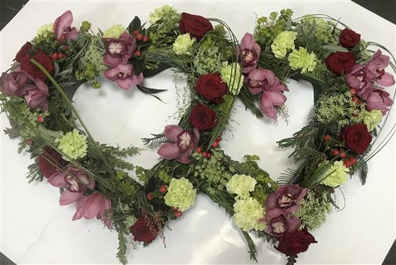 Large Double open heart mixed foliage with red roses, orchids, carnations and hypericum berry