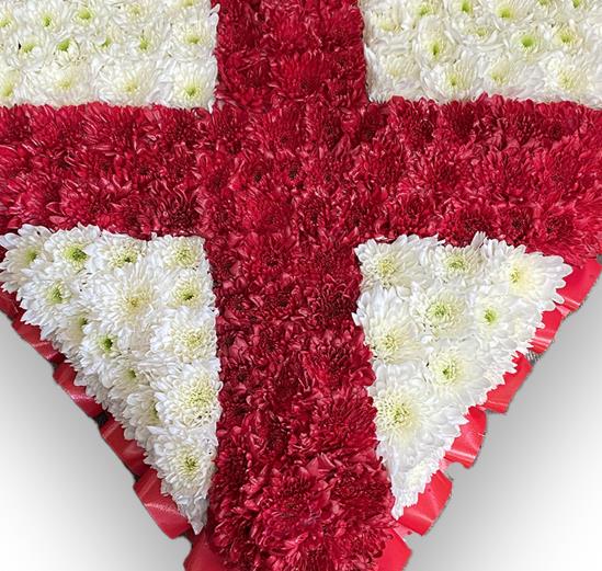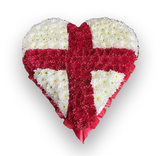 A Red ribbon edged heart, massed in chrysanthemums which is sprayed red creating the england flag