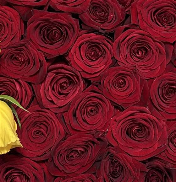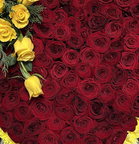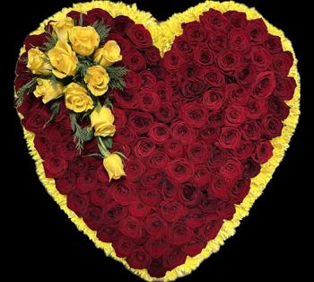 This is a 26 inch heart on a stand , The Heart has been edged in yellow chrysanthemums and then filled with red roses and a yellow rose corsage then placed to one side.