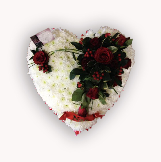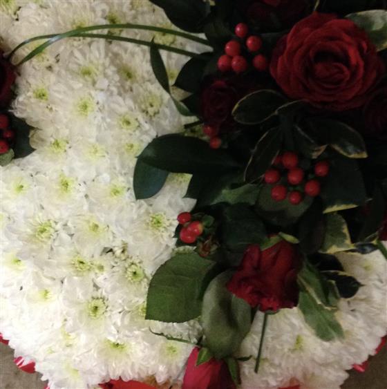 THIS IS A EX-LARGE HEART 23" IN SIZE WHITE HEART WITH RED ROSES AND RED BERRY LARGE SPRAY.