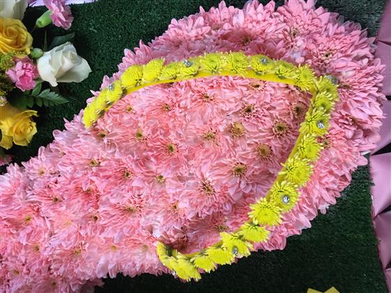 Flip flop this shoe has been made onto a 15 inch pillow base,the shoe has been based in chrysanth and sprayed pink,the straps have been made on a wire then bent around and glued in place to give the arched raised affect, the small yellow flowers have be glued on then small diamonds added.