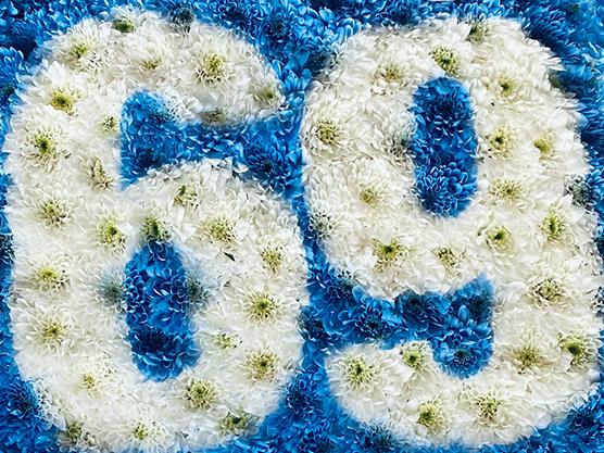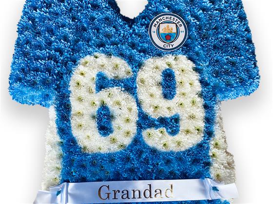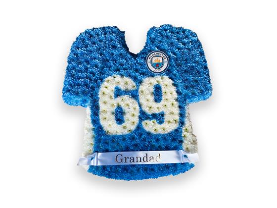 This shirt tribute is massed in white chrysanthemums, which the certain sections are sprayed blue. The teams badge is printed and laminated before being put onto the tribute.