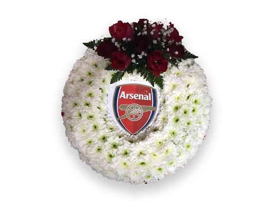 Arsenal football wreath, massed white based with red ribbon edging and spray of flowers and a laminated badge in the centre.