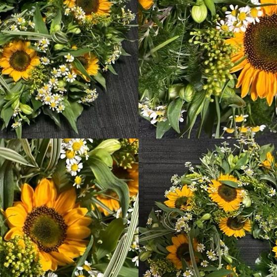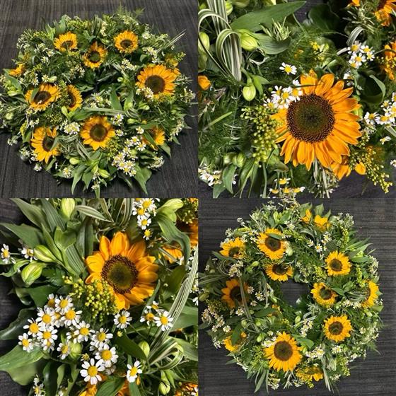 A lovely loose mixed wreath, sunflowers(small sonja sunflowers ),camomile, Veronica, and other seasonal al flowers. Note sunflowers are seasonal, if they are out of season they will be substituted with large yellow Gerbara. Call for more information if you need to.