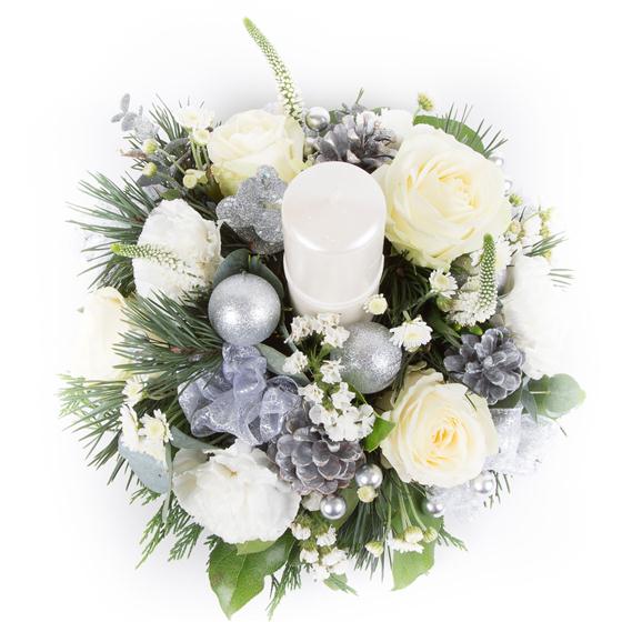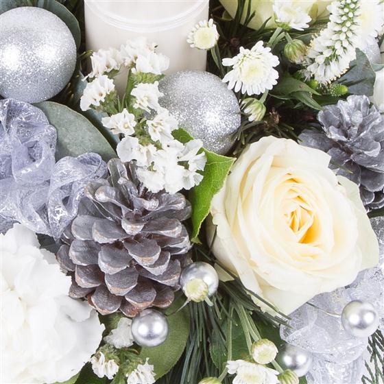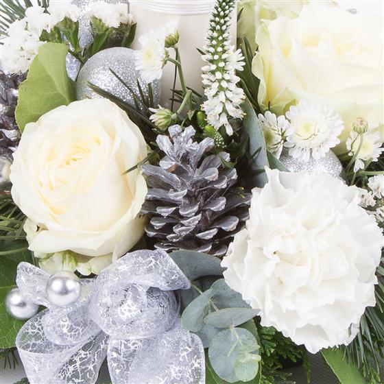 With hints of silver add a frosty look to this all white table centre. placed into a white zinc pot.