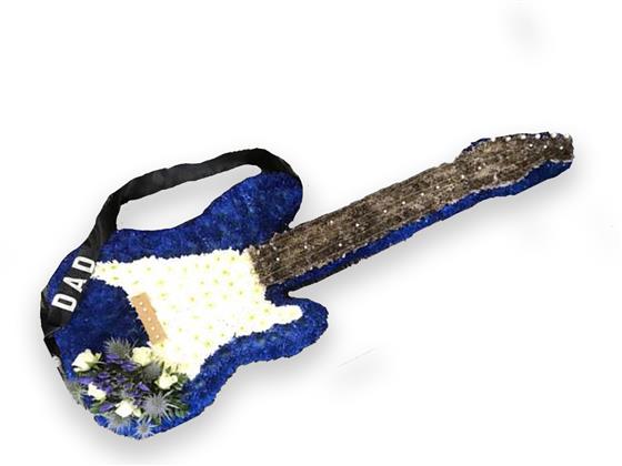 Lovely guitar done in blue and white chrysanthemums, a sash has been added to look like the guitar strap