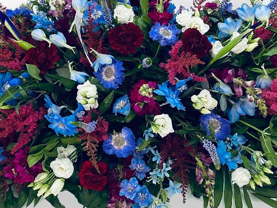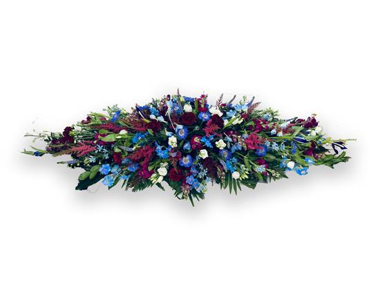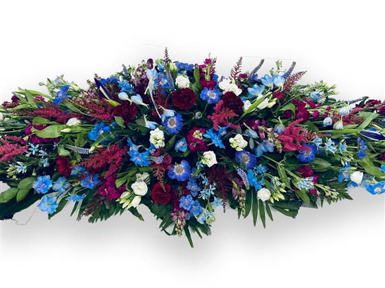 A lovely casket spray, the colours being light blues and burgundys. Flowers are florist choice.
