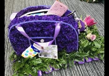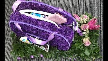open handbag which has been made with chrysanthemums and sprayed purple, a zip on the top to make the bag look open with items coming out the top. ribbon as as side handles and shoulder strap.corsage spray of roses and lily.