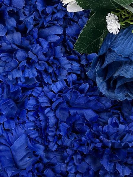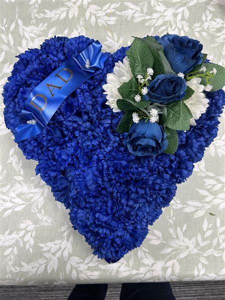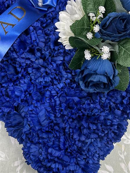 Deep blue heart with sash , overall size 12inch . Silk flower tribute