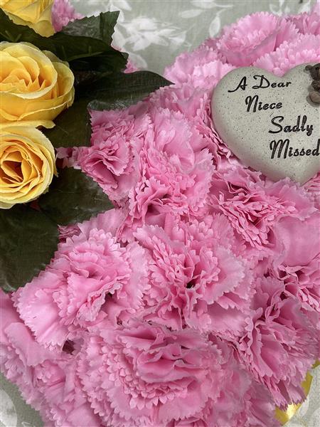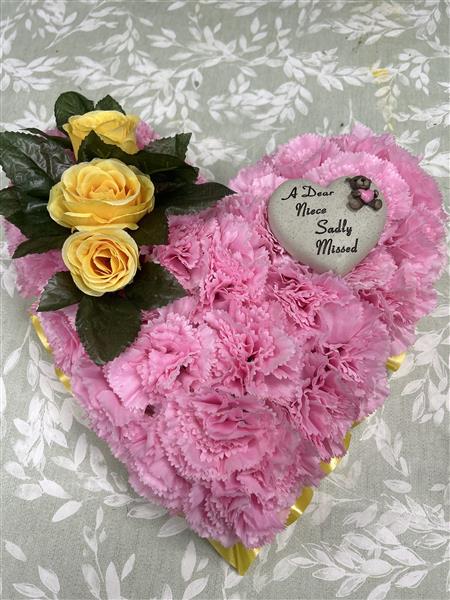 Pretty pink and yellow small heart, carnation and rose with small ceramic heart.