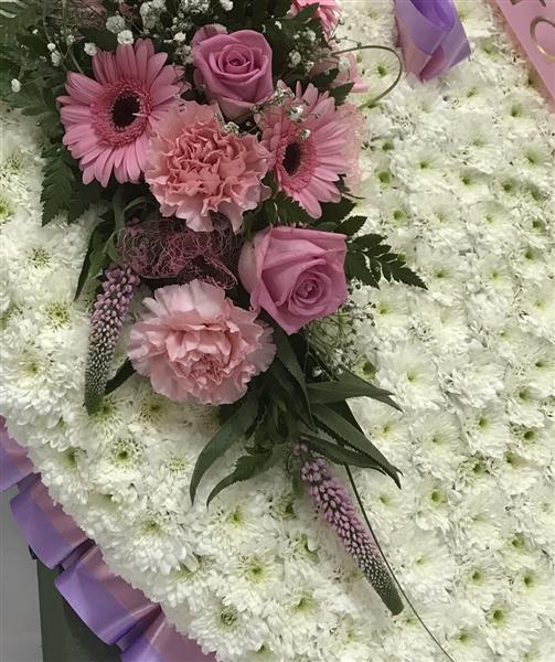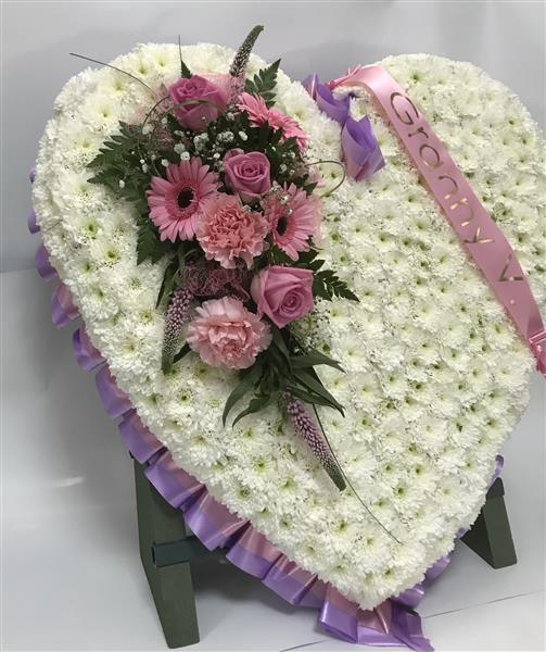 23 inch heart on stand , ribbon edged in two colours on select choice ribbons, based white ,with a large corsage spray to the side, sash included