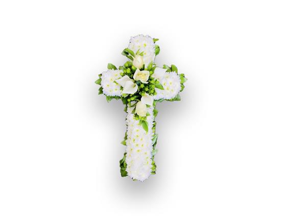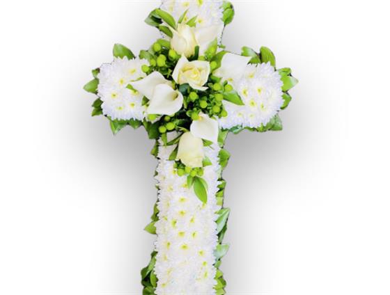 This cross tribute is greenery edged, white chrysanthemum massed with a white and cream corsage.