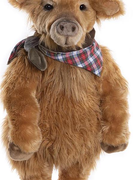 Hoofprints, the Highland Cow, stands proudly at a huge 76cm (30") tall! Made of the finest plush and with only 1000 pieces available, this tall standing beauty will be a treasured addition to any collection. Hoofprints displays a perfect coat of light brown plush, contrasting his chocolate brown hooves and powerful, protruding horns. Complete with a chequered neckerchief. Highland Cow height: 76cm/30"/25.3 Bear Paws.