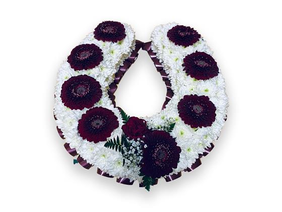 A lovely horse shoe tribute, which has burgundy ribbon edging, is massed in white chrysanthemums with gerbras. And has a corsage at the bottom.