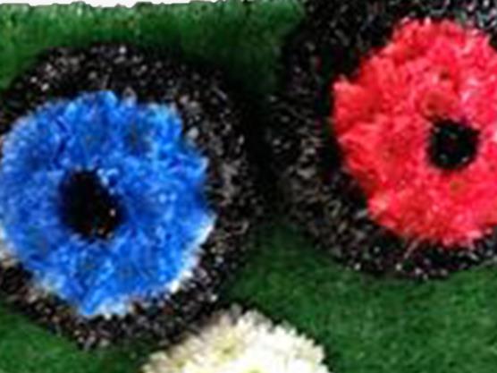 Indoor bowls set on a fake grass board, 3 bowls and the jack