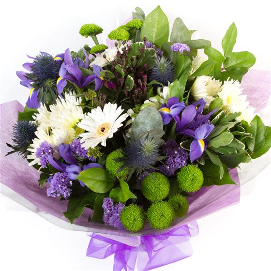 Vibrant limes and purples create a zesty combination of flowers and foliage including alstromeria, carnations, thistles and chrysanthemums. Handtied bouquet(no water) ready to be dropped into customers own vase.