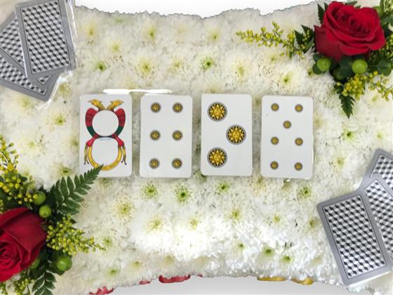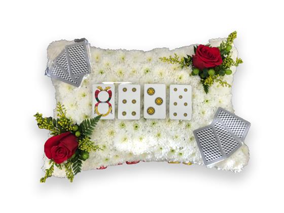 This tribute is massed in white chrysanthemums, and is ribbon edged. With two corsages in corners. The cards will to be provide by the costumers and we will laminate them.