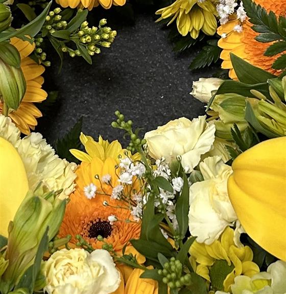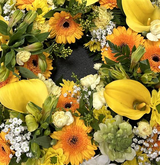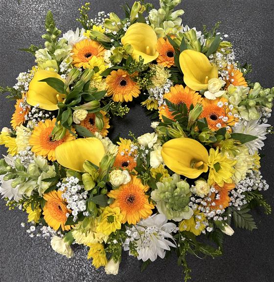 A beautiful mixed wreath of bright yellows and creams, includes Calla lillies, antirrhinums, gerbera and other seasonal flowers.
