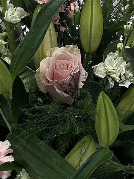 Beautiful selection of seasonal flowers which includes some roses and mixed foliage