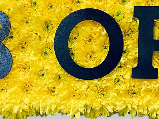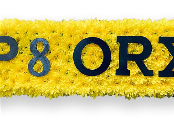 This licence plate tribute is ribboned with black on the edging and massed with yellow chrysanthemums.