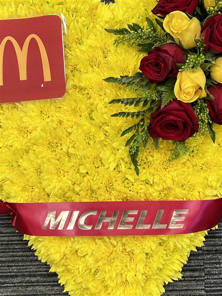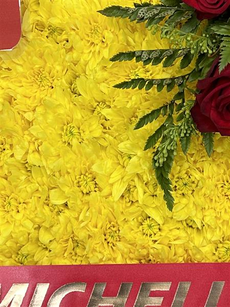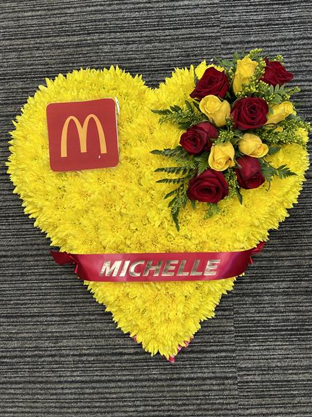 A beautiful Heart,that includes yellow and red roses in the corsage spray, heart massed in a bright yellow chrysanthemum. Ribbon edged
