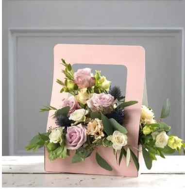 A beautifull arrangement of shades of pink flowers, arranged into a card container , flowers may vary to photo depending on stock availability,
