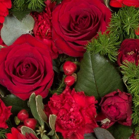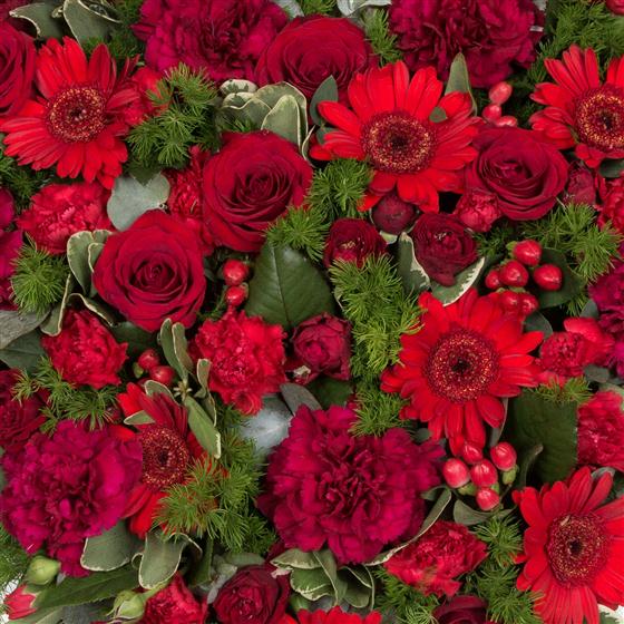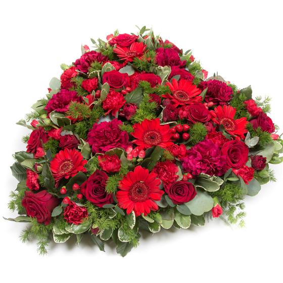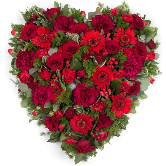 This striking red heart is created using a combination of seasonal foliage, hypericum berries and all red blooms.size 15inch.