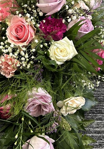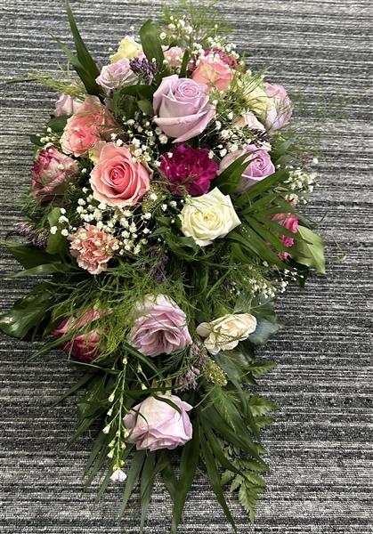 A Single ended spray which is a selection of mainly mixed Roses and filler flowers, these colours may vary to the picture, please select female or male option and we will use our available stock.