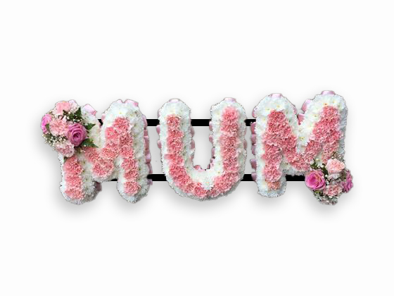 Mum tribute based in chrysanthemums and carnations, corsage rose spray on each letter M.